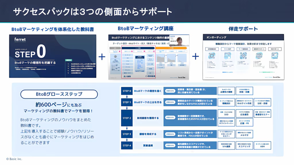 ferretには独自のBtoBマーケティングメソッドである【BtoBグロースステップ】が用意されていて、「再現性のあるステップ」に基づく戦略設計を提示してくれました。