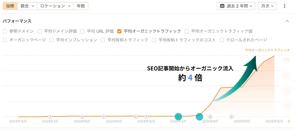 まず、記事を作り始めた6月以降、オーガニック流入が着実に増えていて、全体の流入は最大で約4倍まで伸びました。
