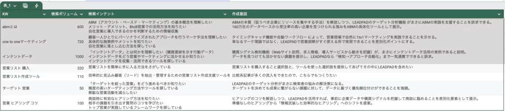 候補キーワードの検索ボリュームや検索意図などを整理したシートの一部
