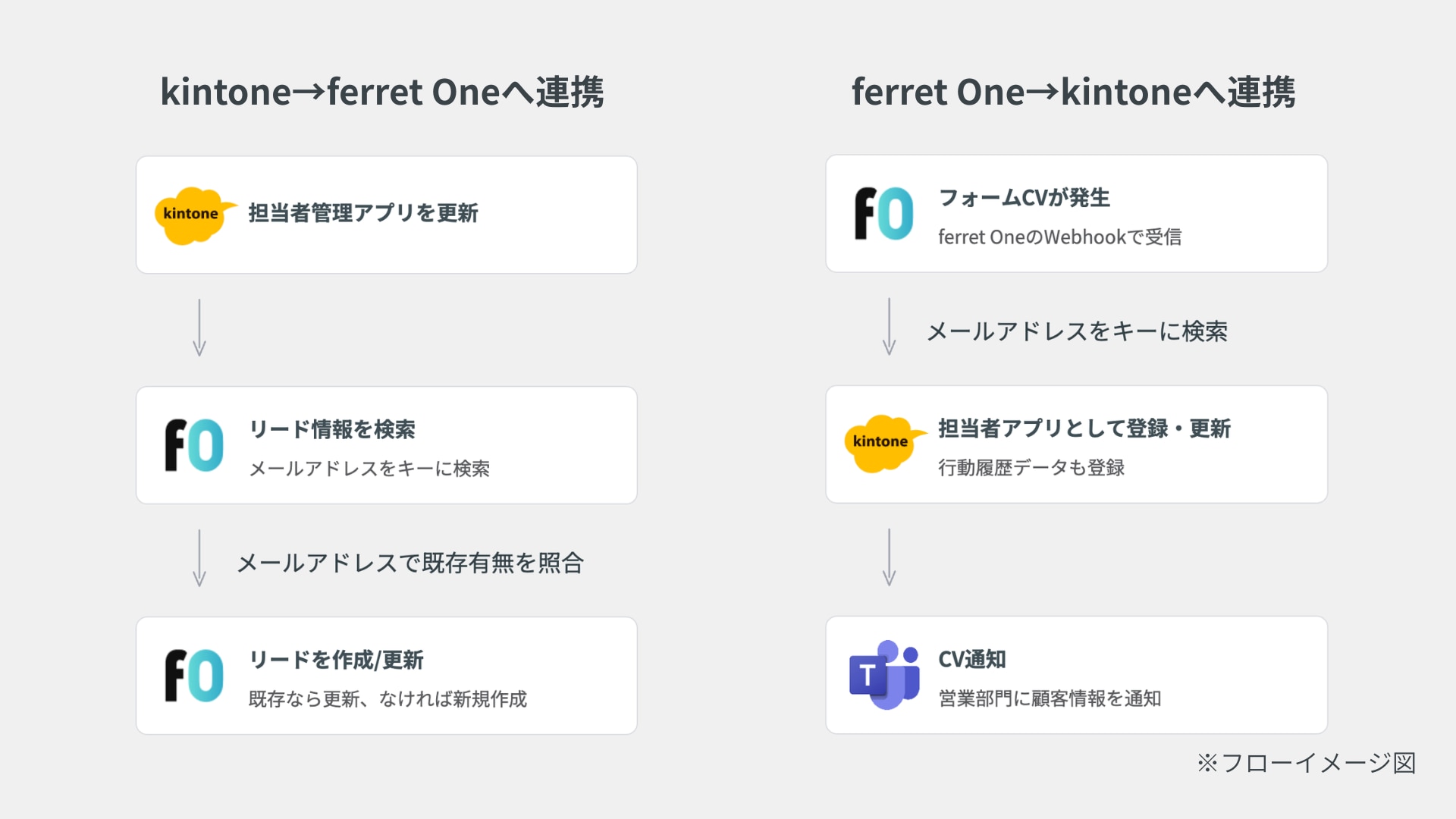 ・MAで獲得したリード情報をkintoneへマッピングして登録。 ・kintone側の最新の顧客データをferret One MAにも自動反映。 ・CV発生時にはTeamsにも自動通知。 |