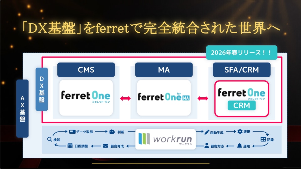 そのデータの一元管理を目指す上で中核となる「ferret SFA/CRM」の開発予定も発表されました。