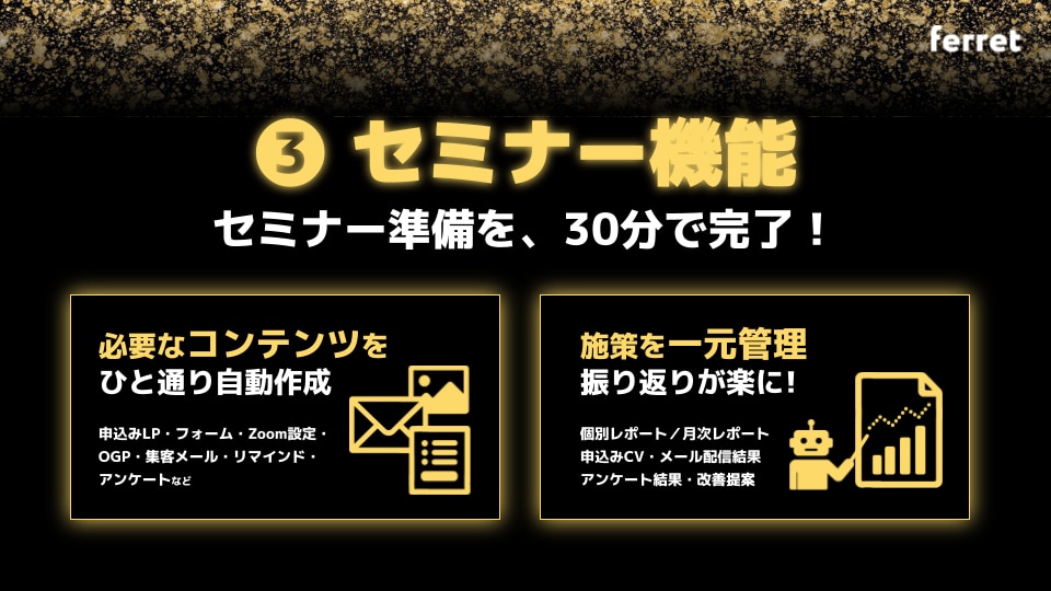特にセミナー機能は昨年の「ferret Year End Party」でも発表させていただいたもので、一部のお客様には大変お待たせをいたしましたが、ようやく年始でリリースの目処が立ちました。