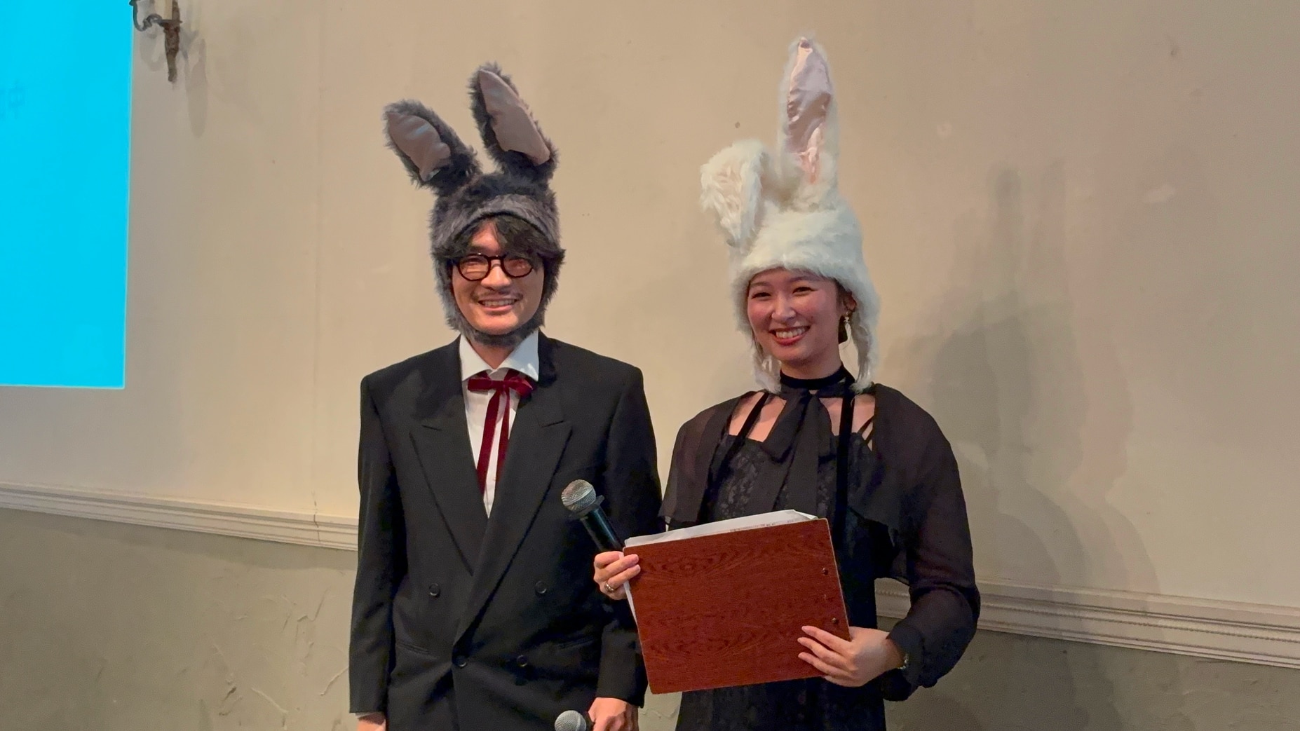 (司会は2年連続でこのペア。ラブブに扮したセールス部近藤と、同じくラブブに扮したCS後藤です)
