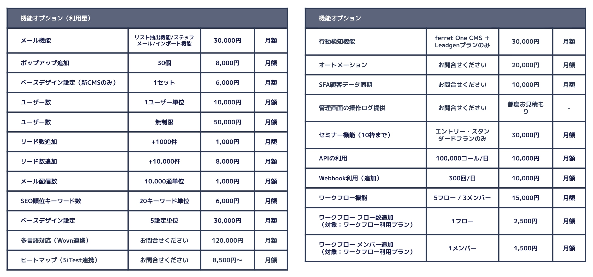 各機能、「ferret One CMS+ナーチャリング」「ferret One MA」「ferret One for MA」プランで利用可能です(ただし上限あり)。