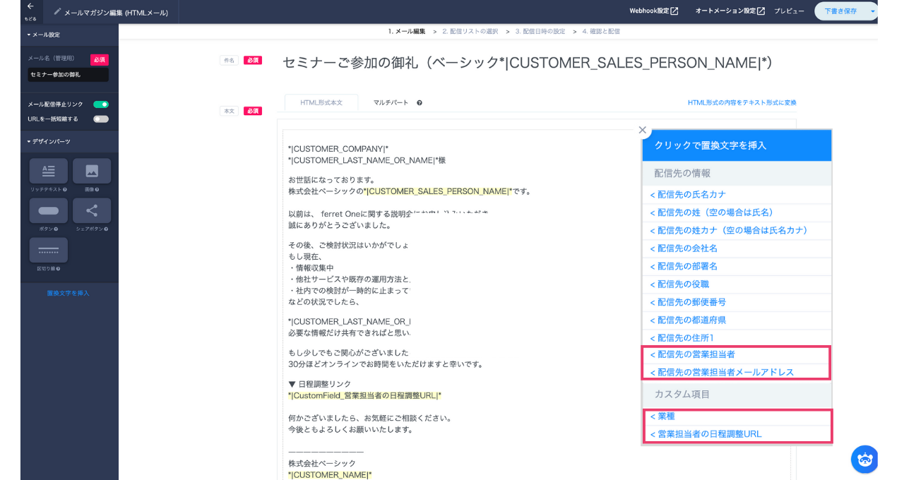 3. メールマガジン機能でメール文を1つ作成。本文に営業担当者名・日程調整URLなどの置換文字を挿入。