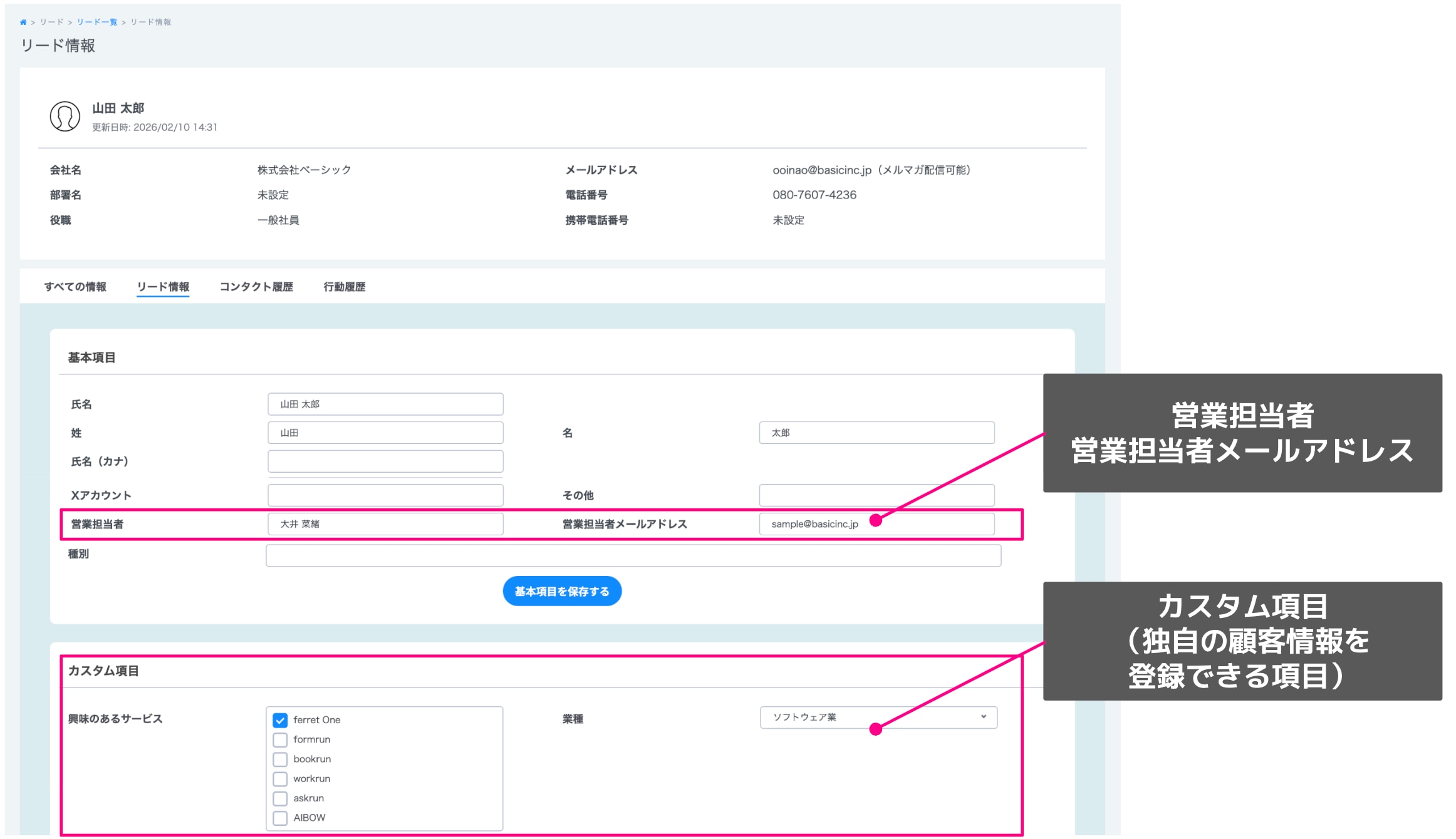 営業担当者名は、リード情報の基本項目>営業担当者・営業担当者メールアドレス、カスタム項目はリード情報内のカスタム項目欄に作成されたものが参照されます。(参考:カスタム項目とは?)