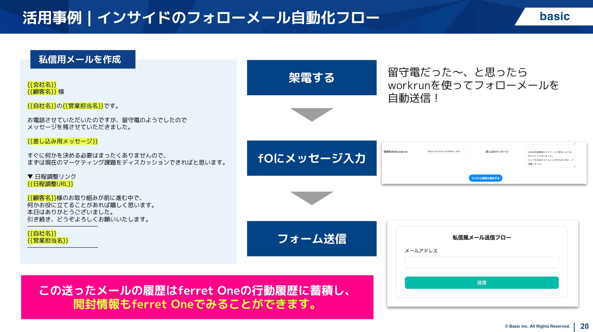 ferret Oneには、行動検知という顧客のサイト訪問を検知できる機能があります。それと、ワークフロー機能を組み合わせれば、行動検知した顧客に、担当営業名義でメールを送信するということも可能です。