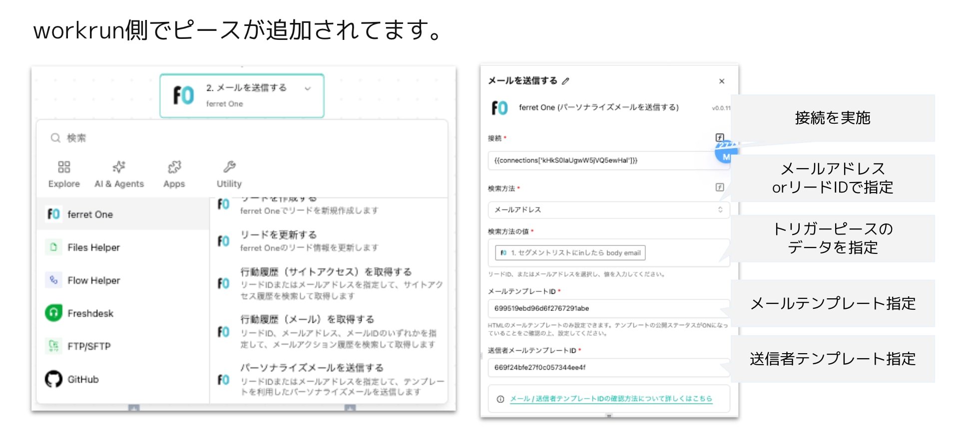 APIに「パーソナライズメール送信」が追加されます。ワークフロー機能(workrun)にピースも追加されていますので、そちらから呼び出してご利用ください。ワークフロー経由でメールを送信することができ、行動履歴も取得することが可能です。