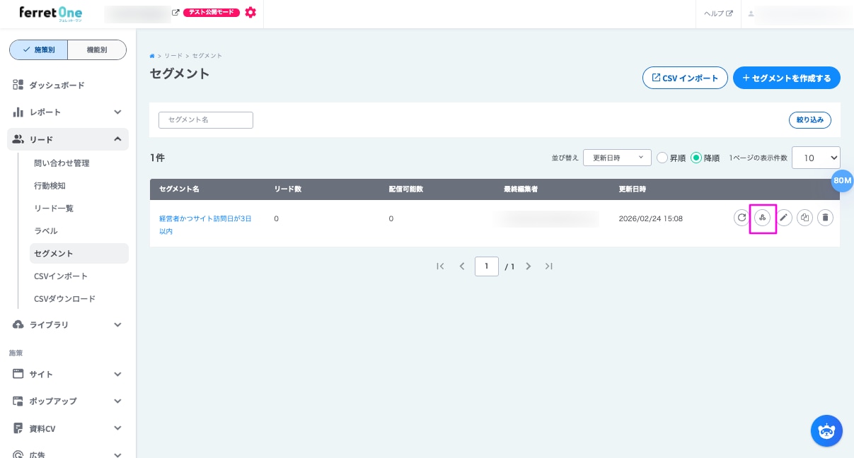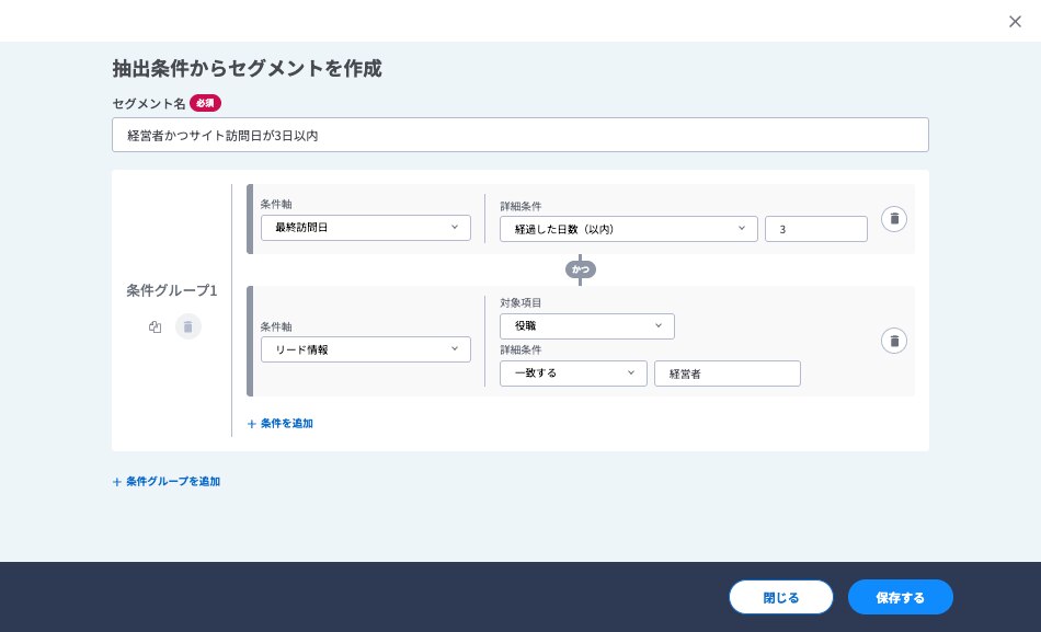 例)経営者かつサイト訪問日が3日以内のセグメントを作成した場合