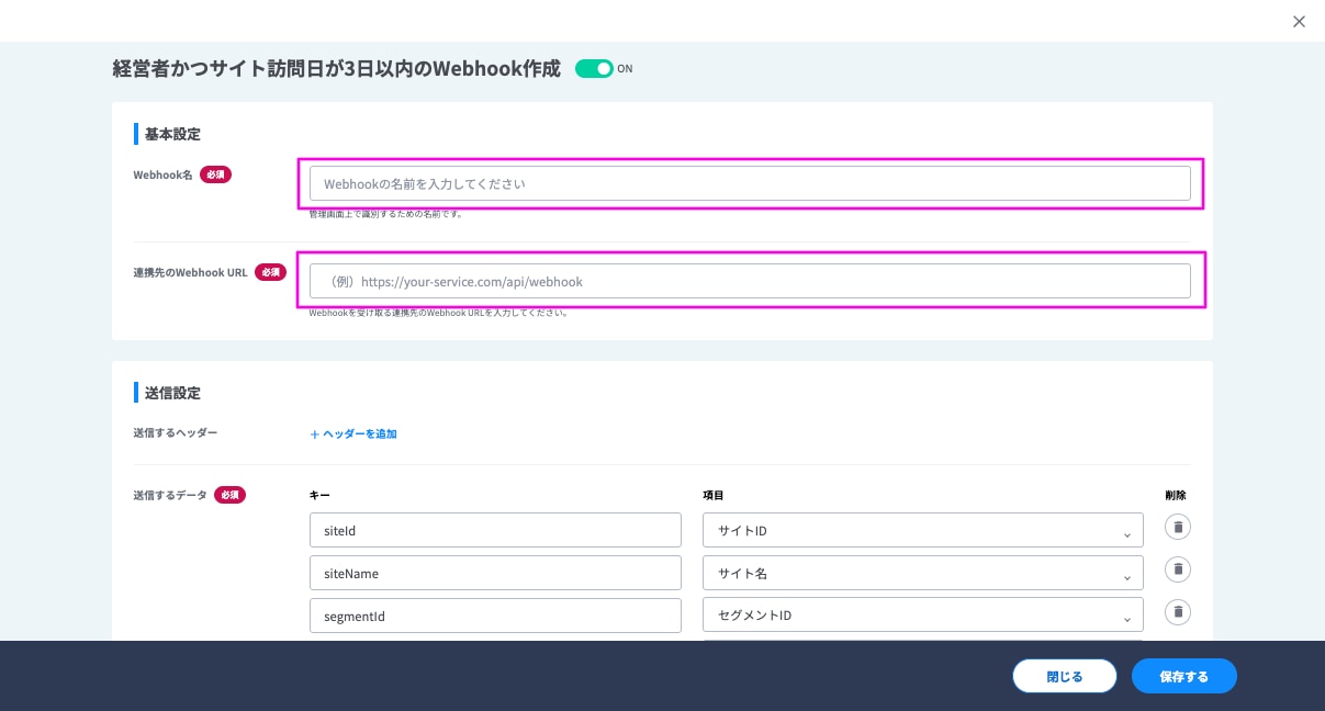 作成したセグメントの赤枠のボタンからWebhookが設定できます。