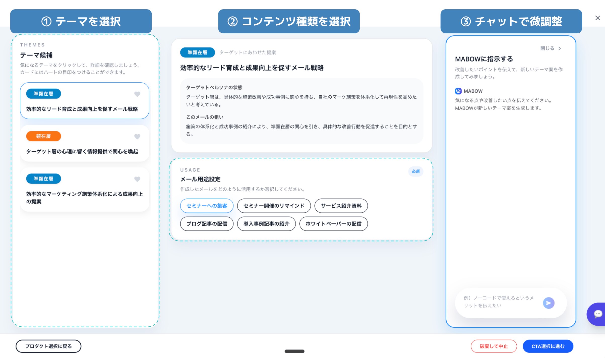 今回新たにリリースしたMABOWメールエージェントでは、従来の機能をさらに発展させ、あらかじめ登録したペルソナや事業情報をもとに施策の起案までサポートできるようになりました。