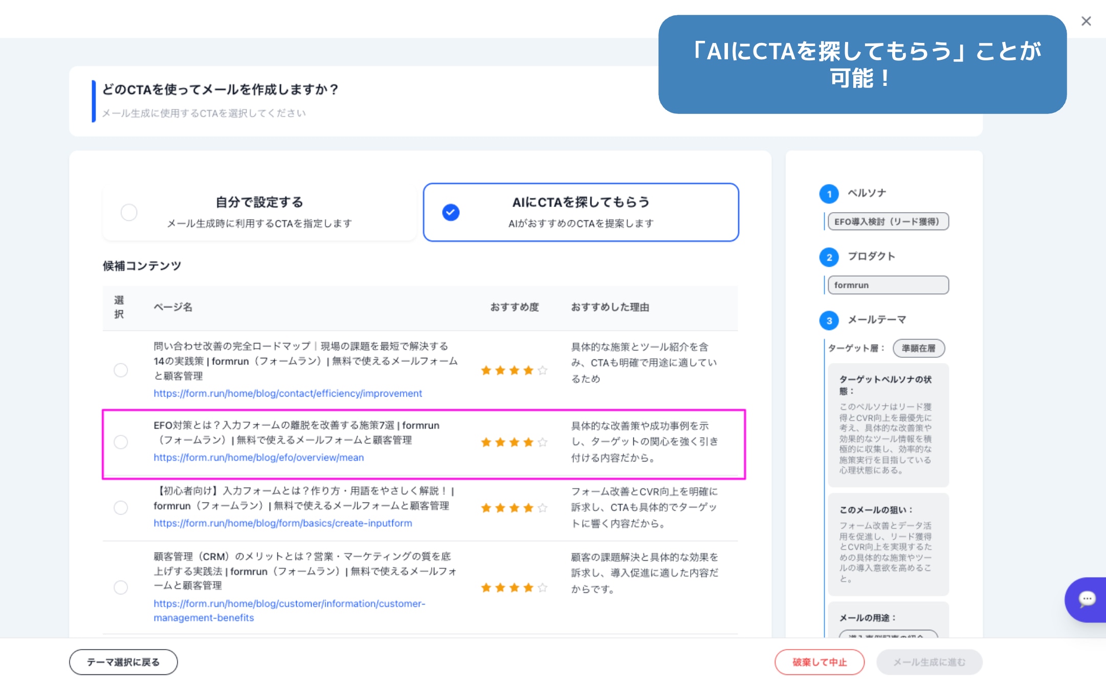 ferret Oneで作成したページや記事などのコンテンツを参照し、メール配信に活用できるテーマを自動で提案します。既存コンテンツを活かしたメール施策を企画しやすくなり、メルマガのネタ出しや企画検討の負担を軽減できます。
