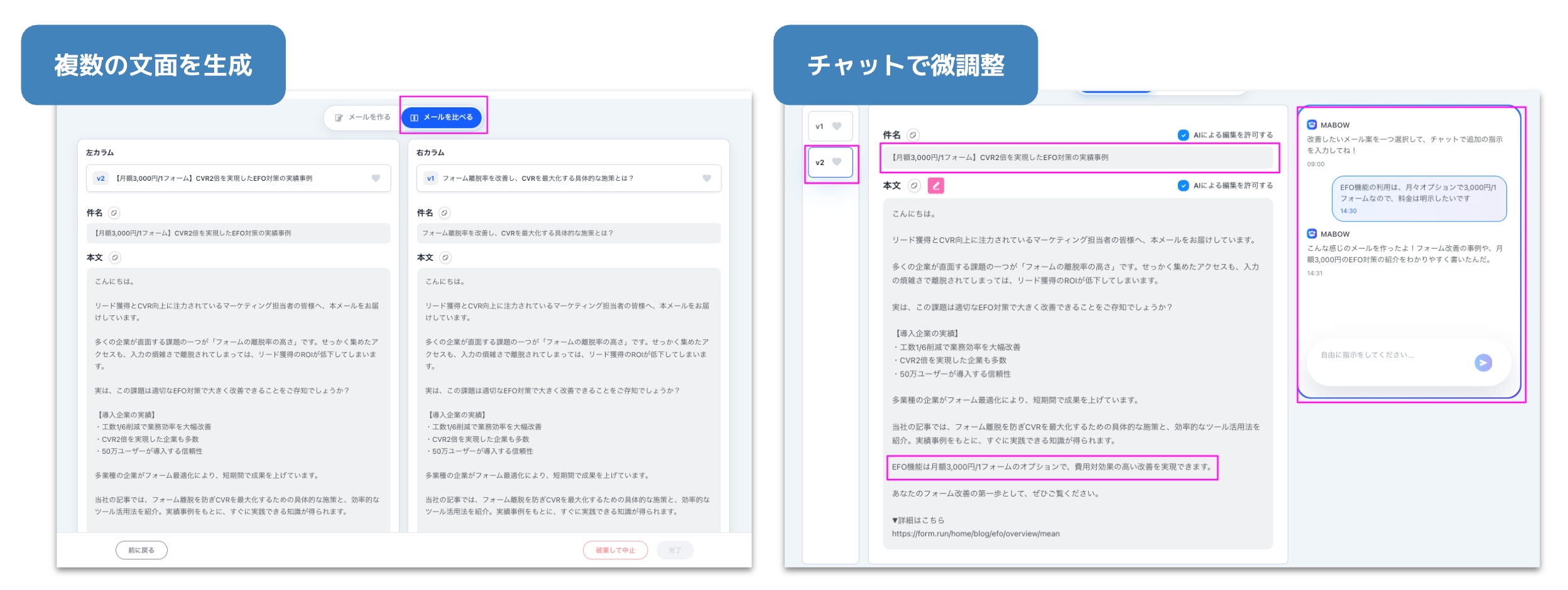従来のMABOW(旧:AIBOW)が進化し、ペルソナやプロダクト情報を学習させることで、マーケティング目的に合ったメール案を短時間で作成できるようになりました。