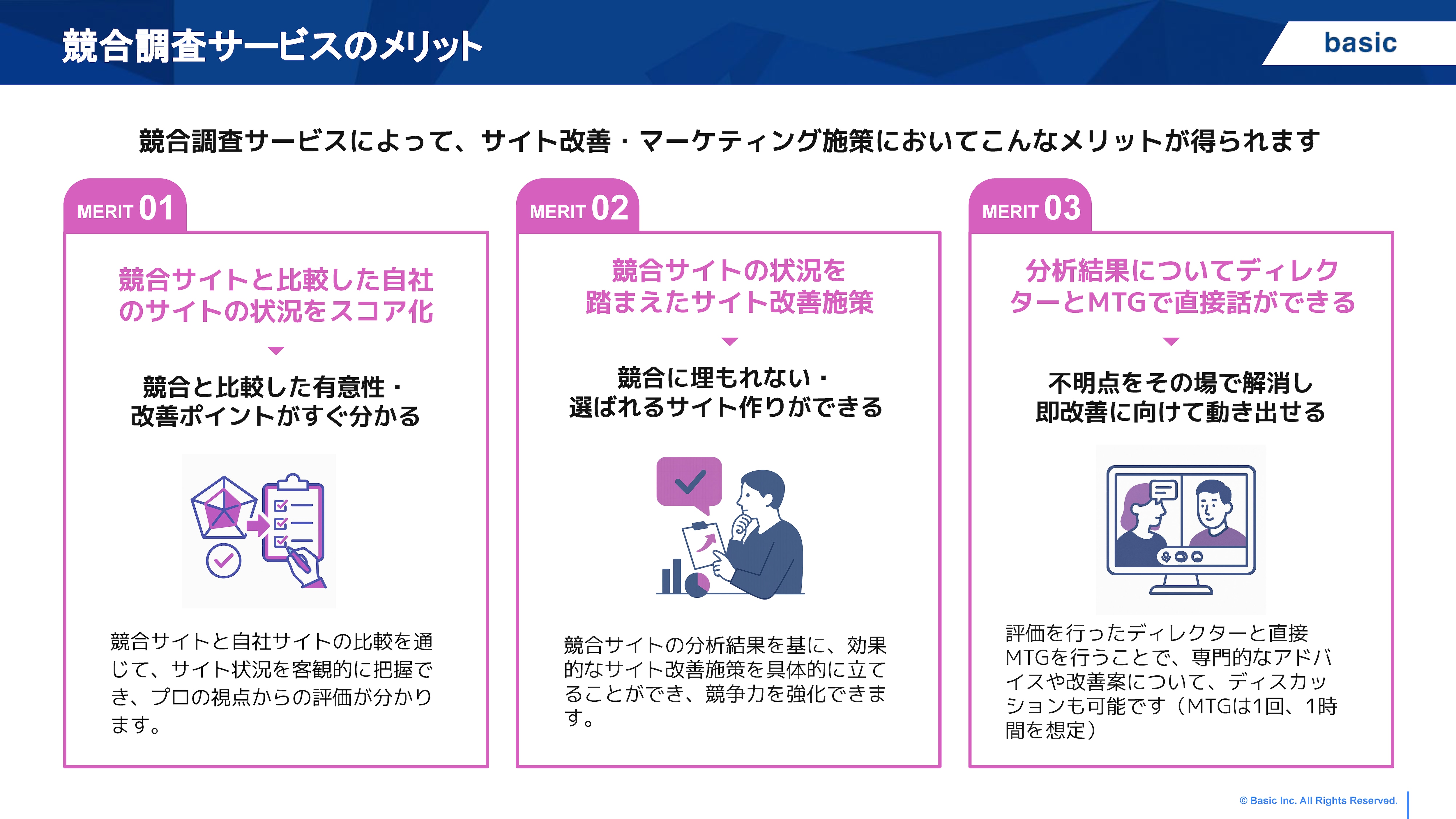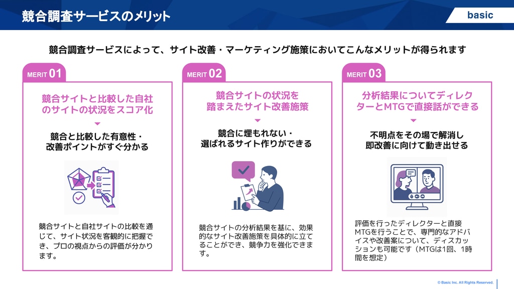 競合分析調査では、競合サイトの徹底調査を行い、差別化のポイントを浮き彫りに。