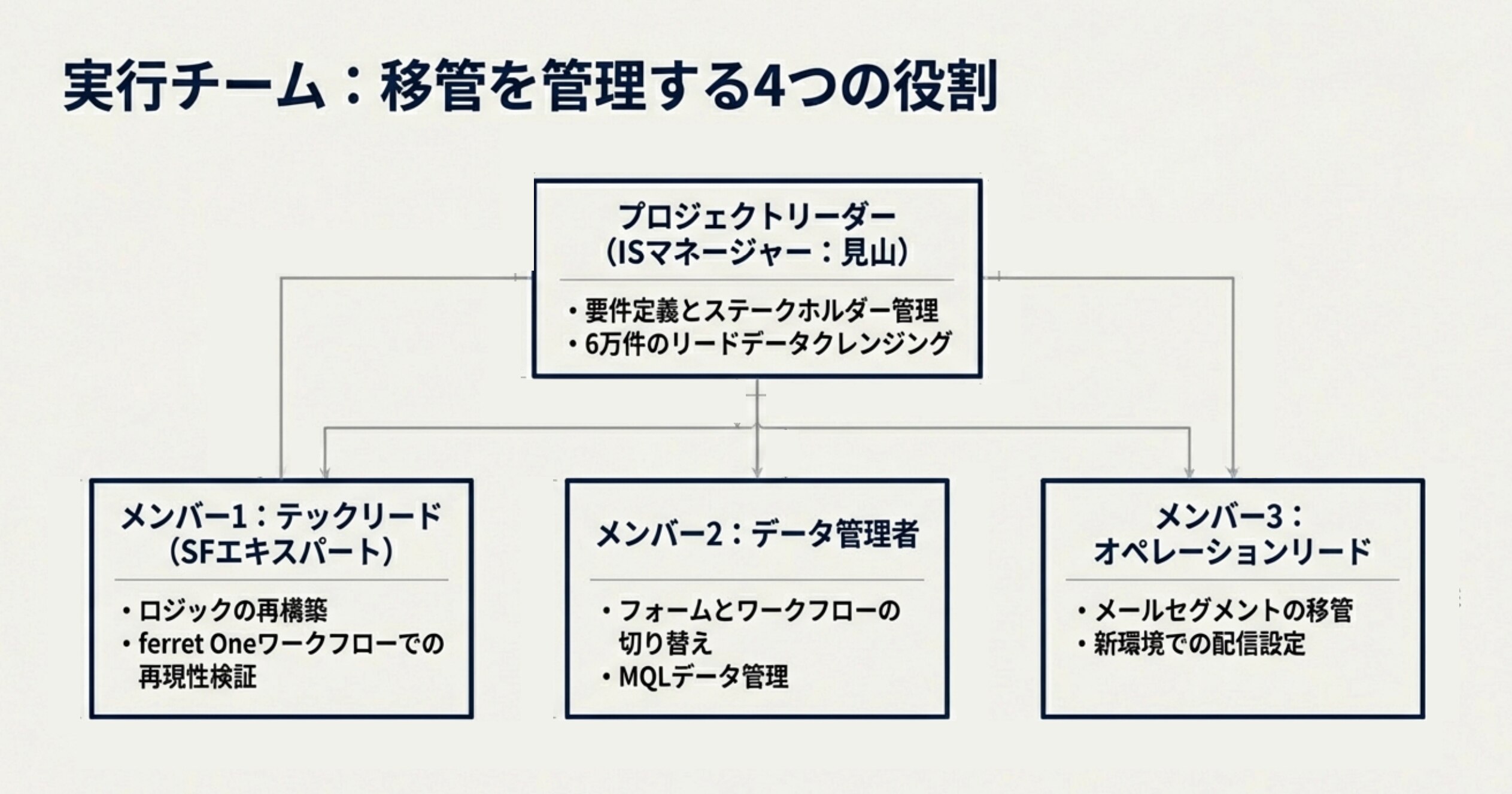 技術面では、1人目:Salesforce設計の担当者に、これまでのMAとSalesforceでつないでいた複雑な座組みが、ferret One MAとワークフロー機能だけで実現可能かどうかの検証とロジックの組み替えを担ってもらいました。