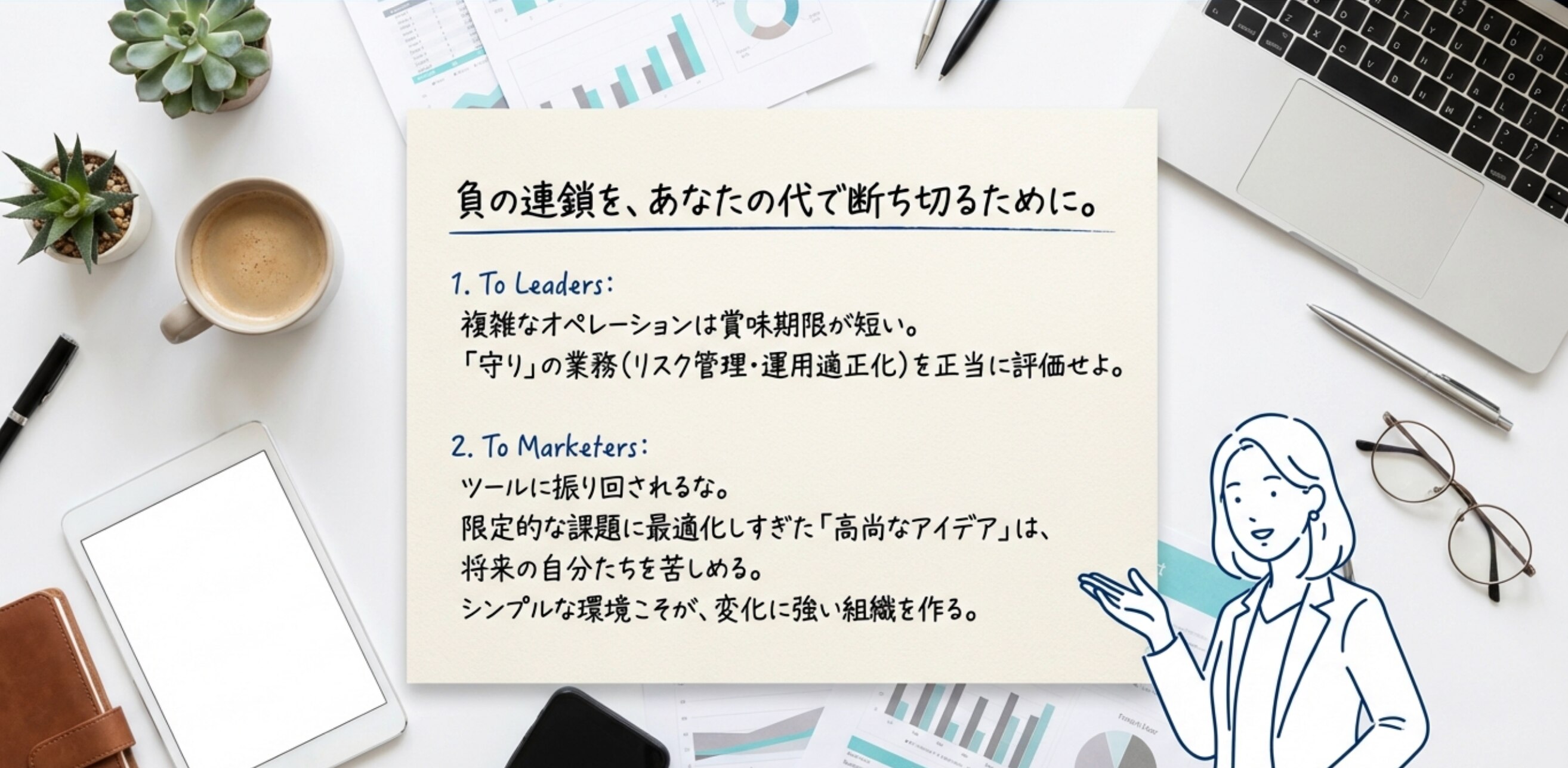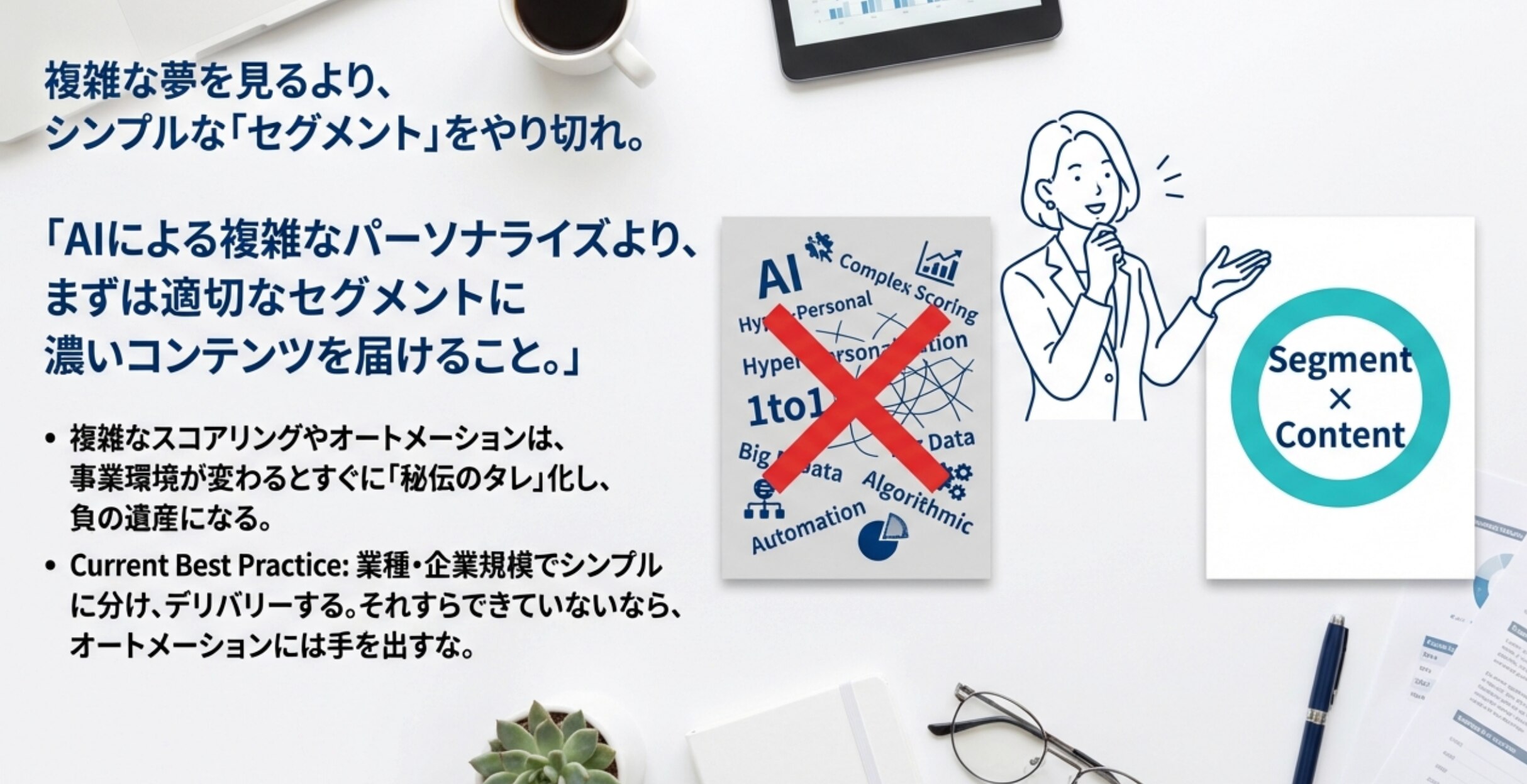今の時代、AIによってよりパーソナライズ化されたコンテンツが求められていますが、だからといって当時の状況に最適化しすぎた複雑なオートメーションやスコアリングを組んでしまうと、事業環境が変わった瞬間にまた「秘伝のタレ」化して運用が困難になるリスクがあります。