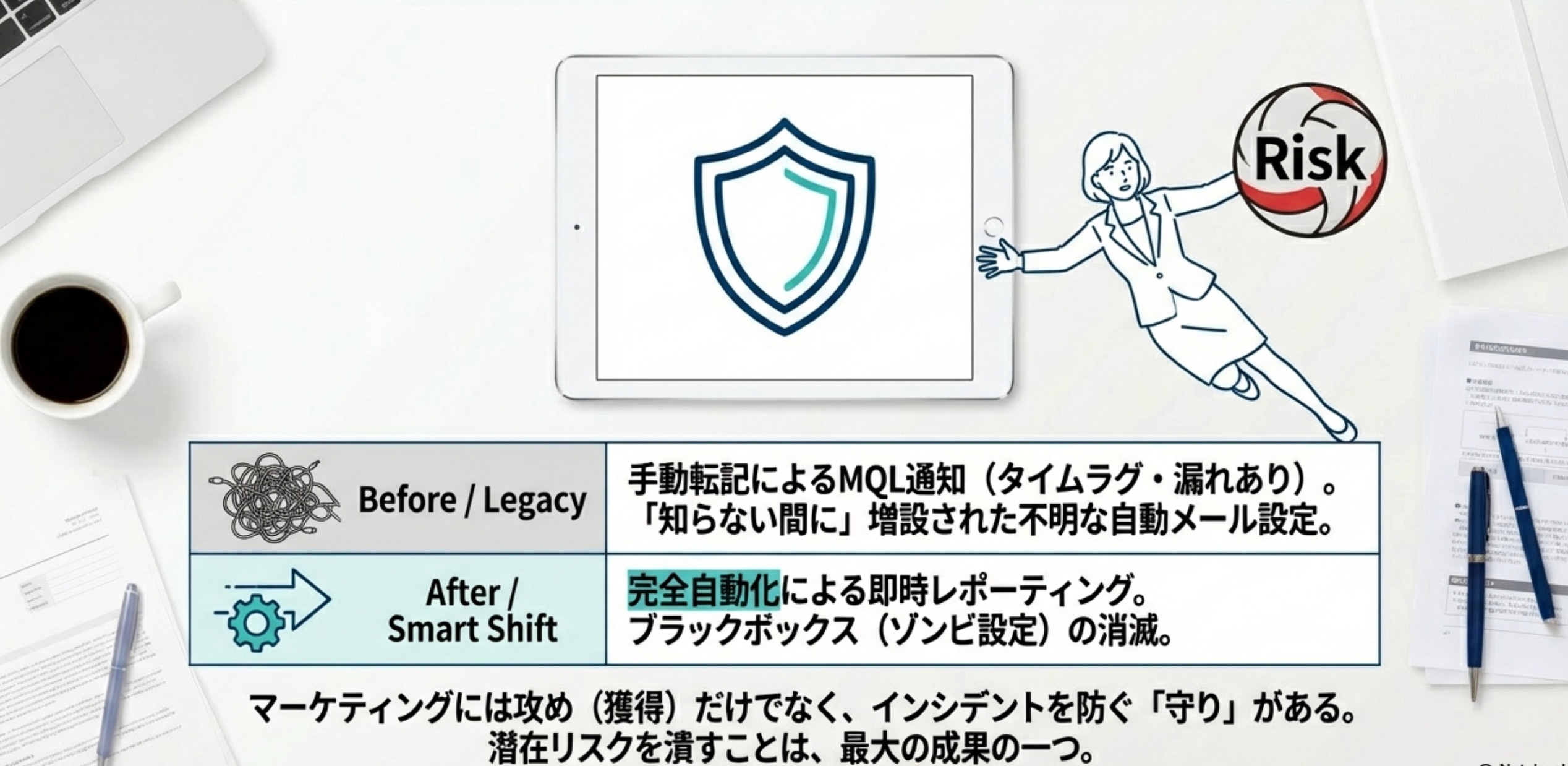 多機能すぎるMAツールで運用が複雑化するほど、こうした守りのリスクは常に高まります。誰も知らぬ間に複雑なオートメーションでメールが送られ、顧客体験が損なわれているかもしれません。