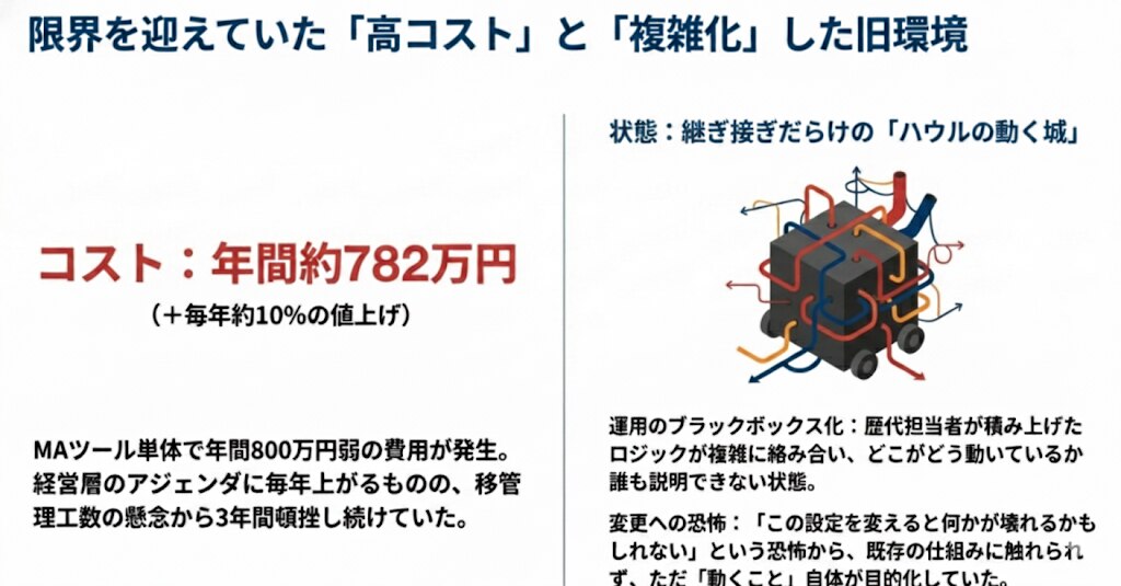 MAツール単体で年間約800万円もの費用がかかっていたんです。その上、毎年約10%ずつ値上がりしていました。当然このコスト高はマーケ部内でも問題視されていましたが、マーケ部だけでなく、経営層でも毎年アジェンダに上がっている問題でした。金額が金額なので。