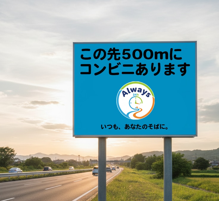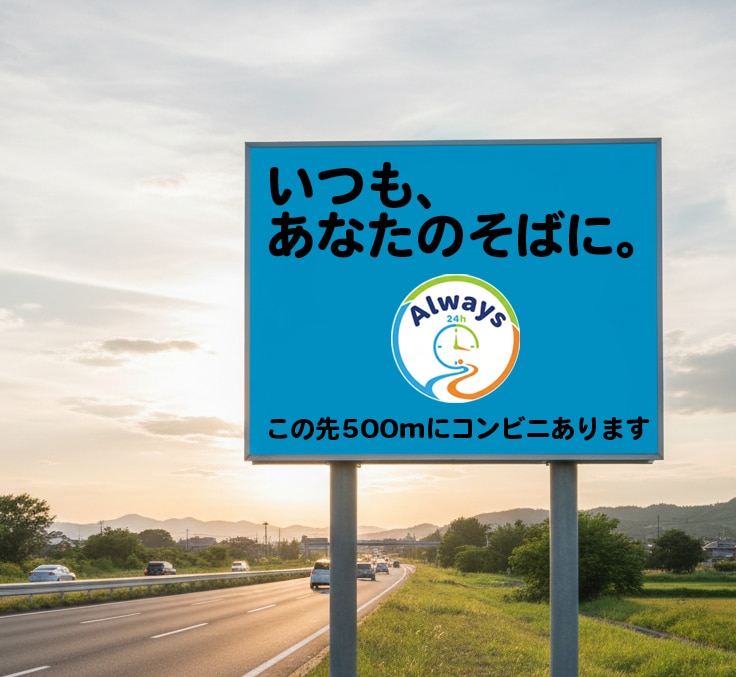 これは「Alwaysという架空のコンビニエンスストアが国道沿いに看板を立てた」と仮定した場合のAI生成イメージ画像です。