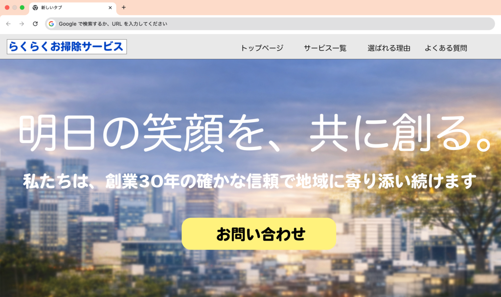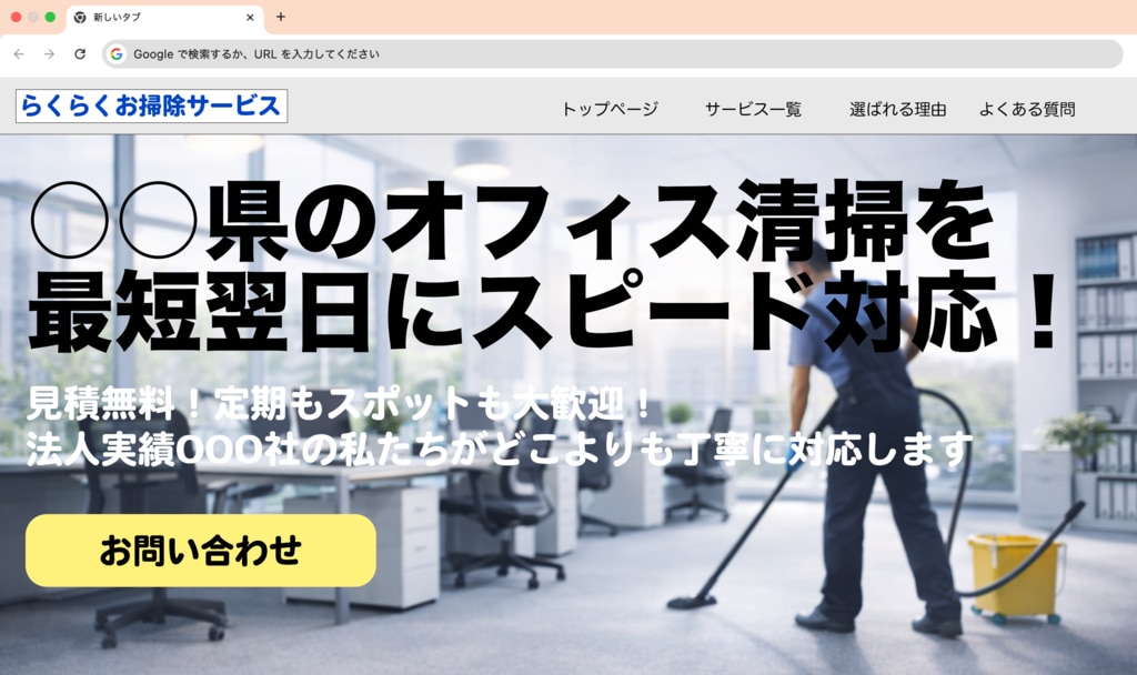 同じく「自社のオフィスを清掃してくれる業者をインターネットで探す」というシミュレーションにおいて、私が業者であるなら、ファーストビューをこのように制作します。