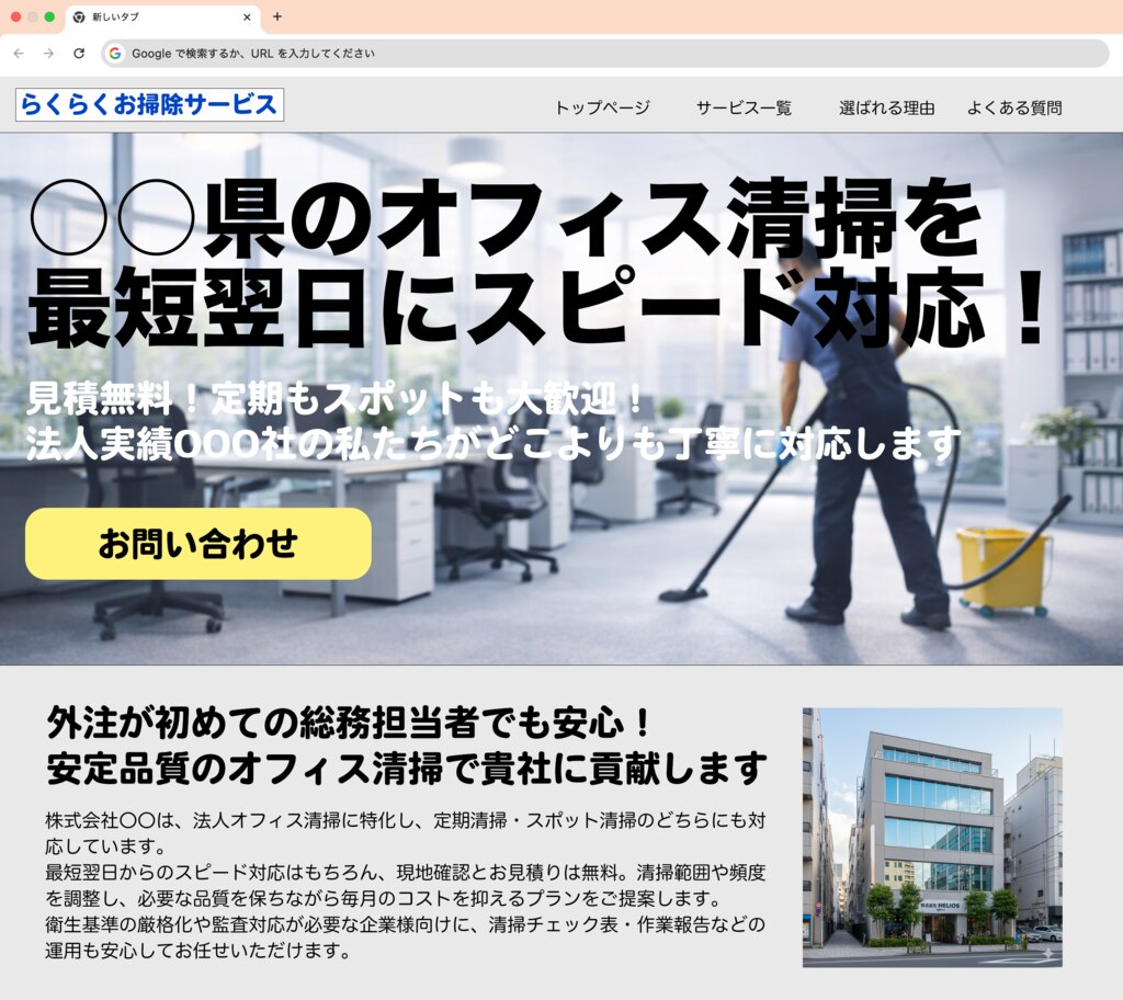 もしも私がオフィス清掃業者であるなら、ターゲットの動線を考慮し、このような文章を制作します。