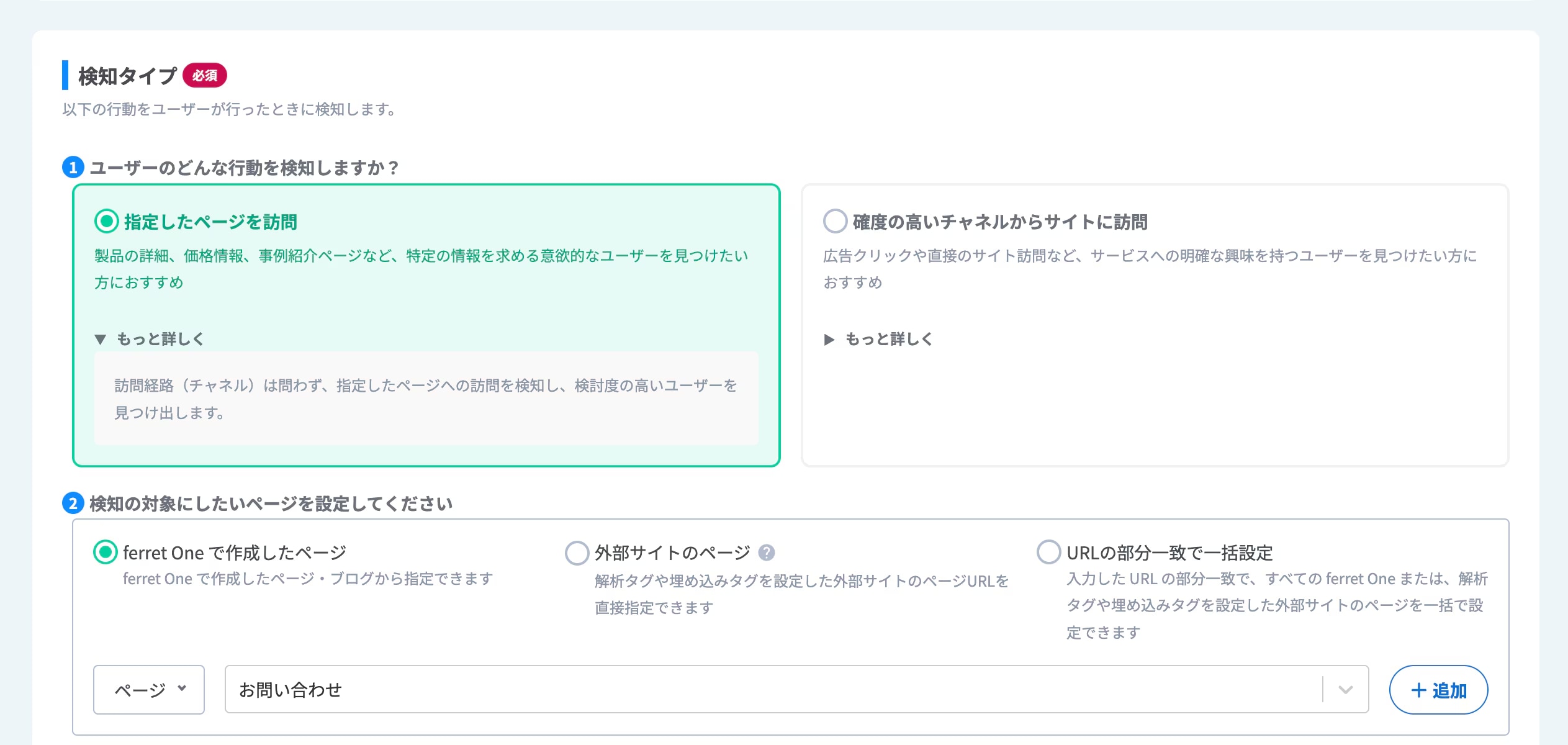 基本的な設定は汎用的だと思います。料金ページ、お問い合わせページ、資料請求ページ、事例ページなどは、どの業界でも効果的な検知ポイントになるでしょう。