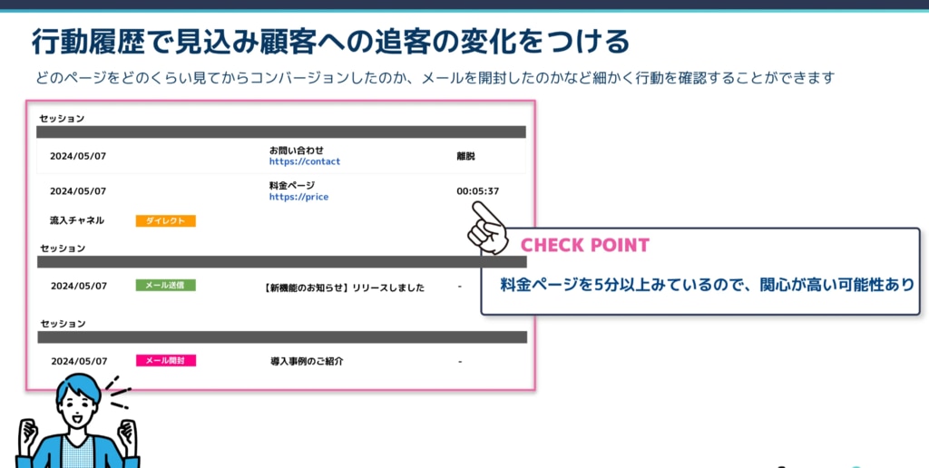 逆に『本当に熱いリード』も行動履歴から判別できます。例えば、複数のページを順番に閲覧している場合や、その閲覧順序に明確な意図が感じられるケース、あるいは料金ページに一定時間留まっている場合などは、高確率で商談につながります。