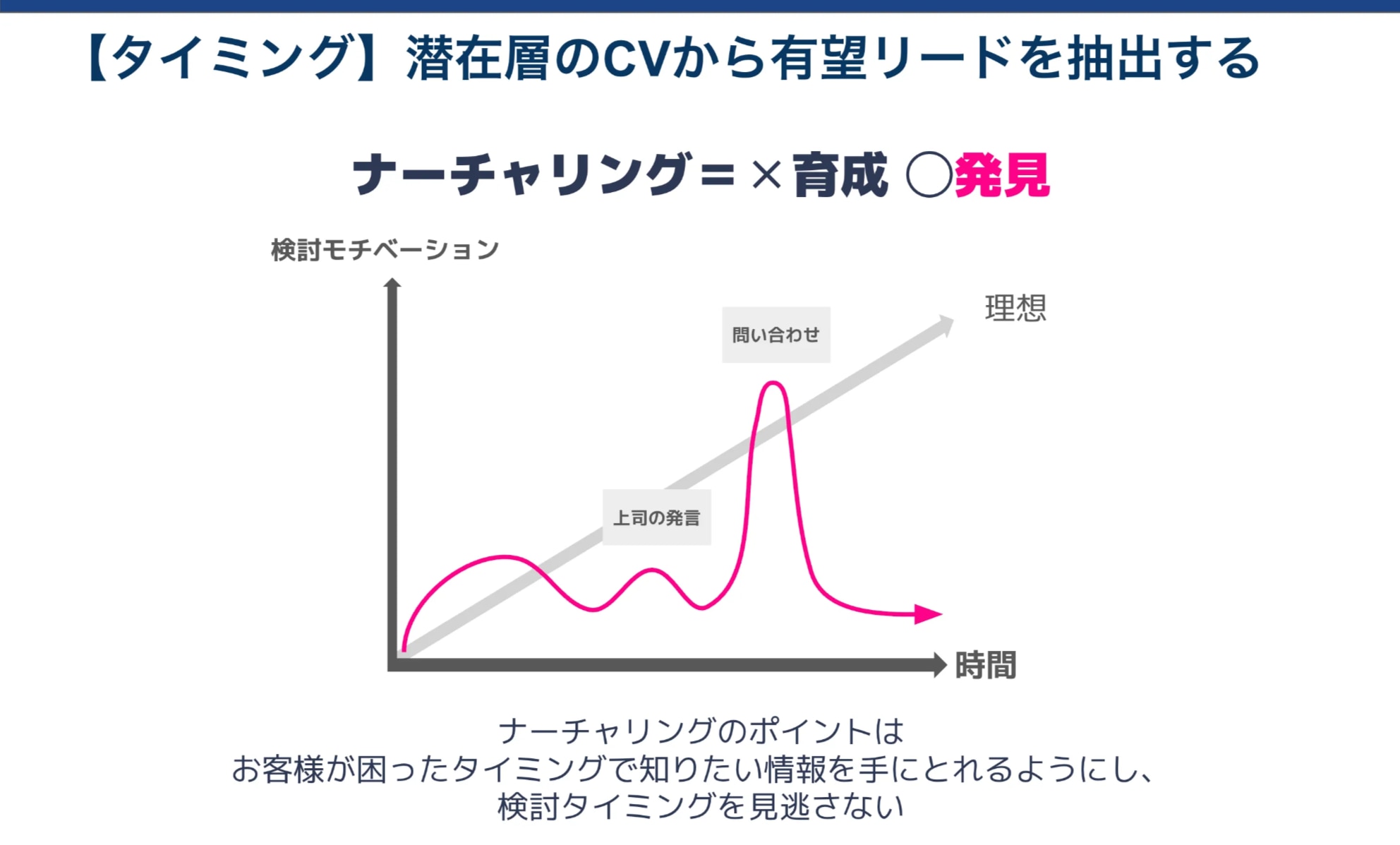 実際、顧客の本当の検討タイミングは営業側からは完全に不可視です。いくら経験豊富な営業でも、顧客が社内で予算を確保した瞬間や、競合製品の検討を始めた瞬間を知ることはできません。