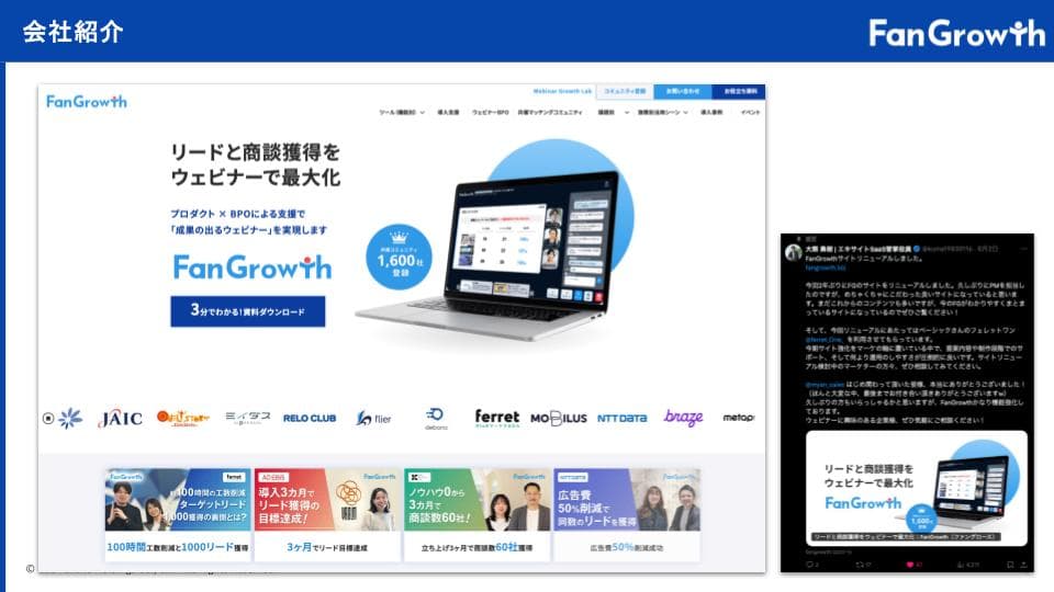 本ウェビナーで登壇した大熊氏は同事業を管掌し、ウェビナー支援SaaS「FanGrowth(ファングロース)」をはじめとするBtoBプロダクトの開発・提供を強力に推進している。
