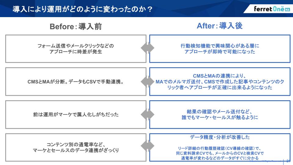 大熊氏:そうなんです。CMS、MA、SFAが今シームレスにつながっているので、コンテンツ作成の改善が非常にやりやすくなりました。今まではCMSはCMS、MAはMA、SFAはSFAのデータをそれぞれ見て、うんうん唸りながらストーリーを作っていた。ここが一元管理できるようになったので、圧倒的に工数削減はできていると思います。