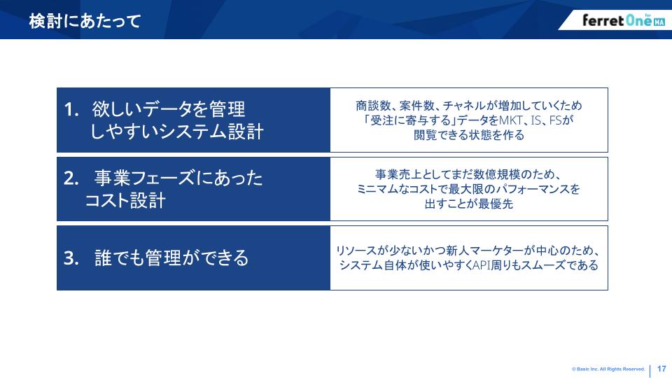 大熊氏:まず前提として、本セミナーではferret One MAの事例としてお話ししていますが、我々は最初からferret One MAのツール検討をしていたわけでは全くありませんでした。