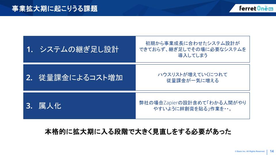そして3つ目が「属人化」です。 Zapierのつなぎ込み設定だったり、スプレッドシートでのデータクレンジングだったり、こういった作業が特定の「できる人」がいないと回らなくなってしまったんです。その人が事業を回さなきゃいけないので、ある意味勝手にやってくれる状態になる。 そうすると、もうその人以外、誰もシステム構成が分からなくなる。 これが事業人数20人規模の時に、明確な課題として出てきました。