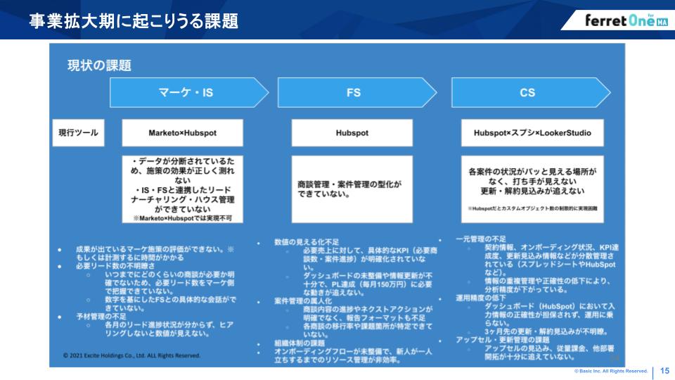 大熊氏:事業拡大に伴い、各部門が都度必要なプロダクトを導入してしまい、システム連携がうまくいかない状況となってしまいました。