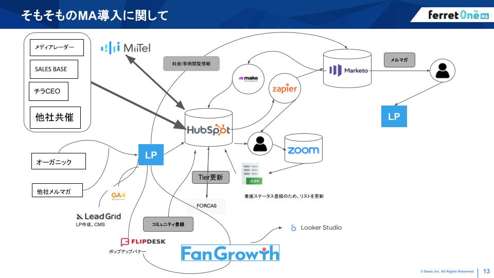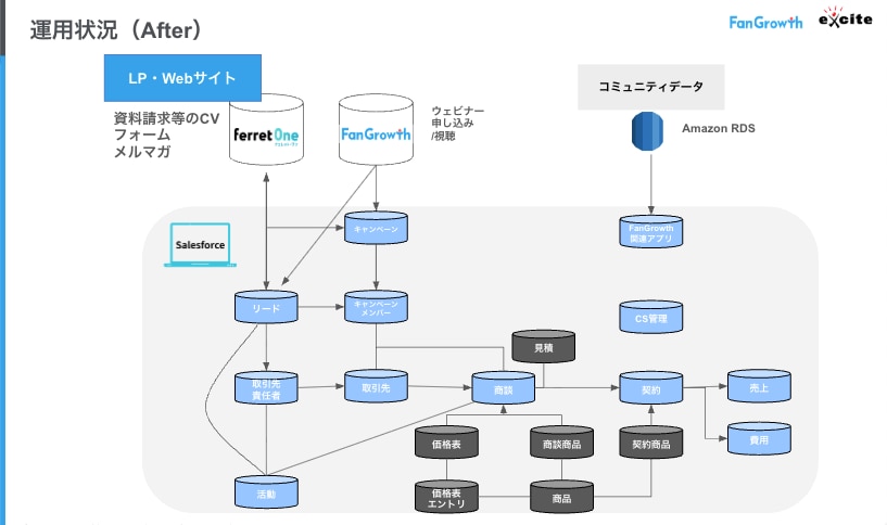 大熊氏:マーケツールは基本的にSalesforce、ferret One MA、FanGrowthの3つで完結する形を想定しています。データ基盤がようやく整った、というのが今回の一番大きいところですね。