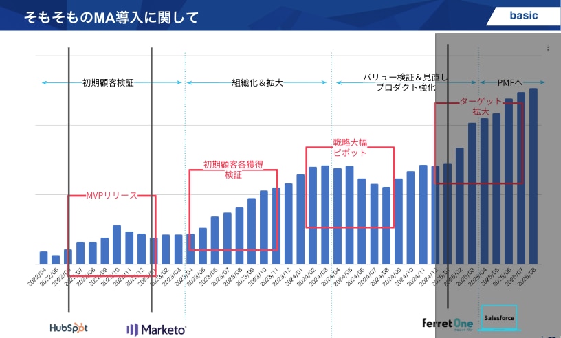 大熊氏:事業立ち上げからの月額売上推移を出しています。ツールに関しては、最初はHubSpot、その後Marketo、そして今回ferret One MAとSalesforceという形にシステムを変えてきています。