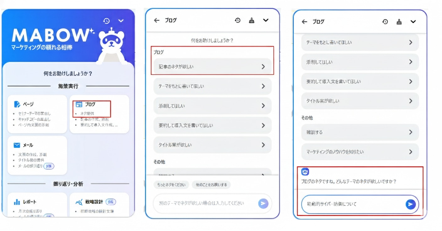 現在、MABOWはブログ記事制作、メルマガの下書き作成、サイトのテキスト作成など、多岐にわたる業務で活用しています。