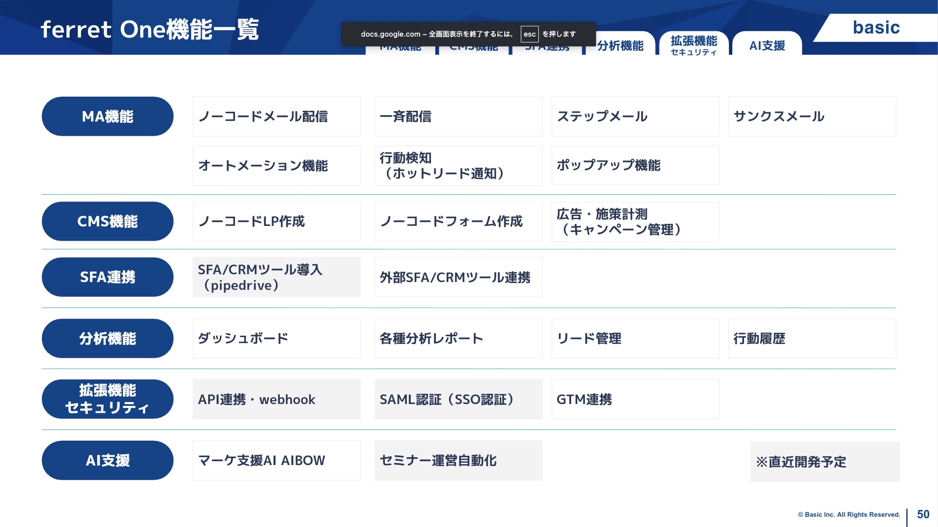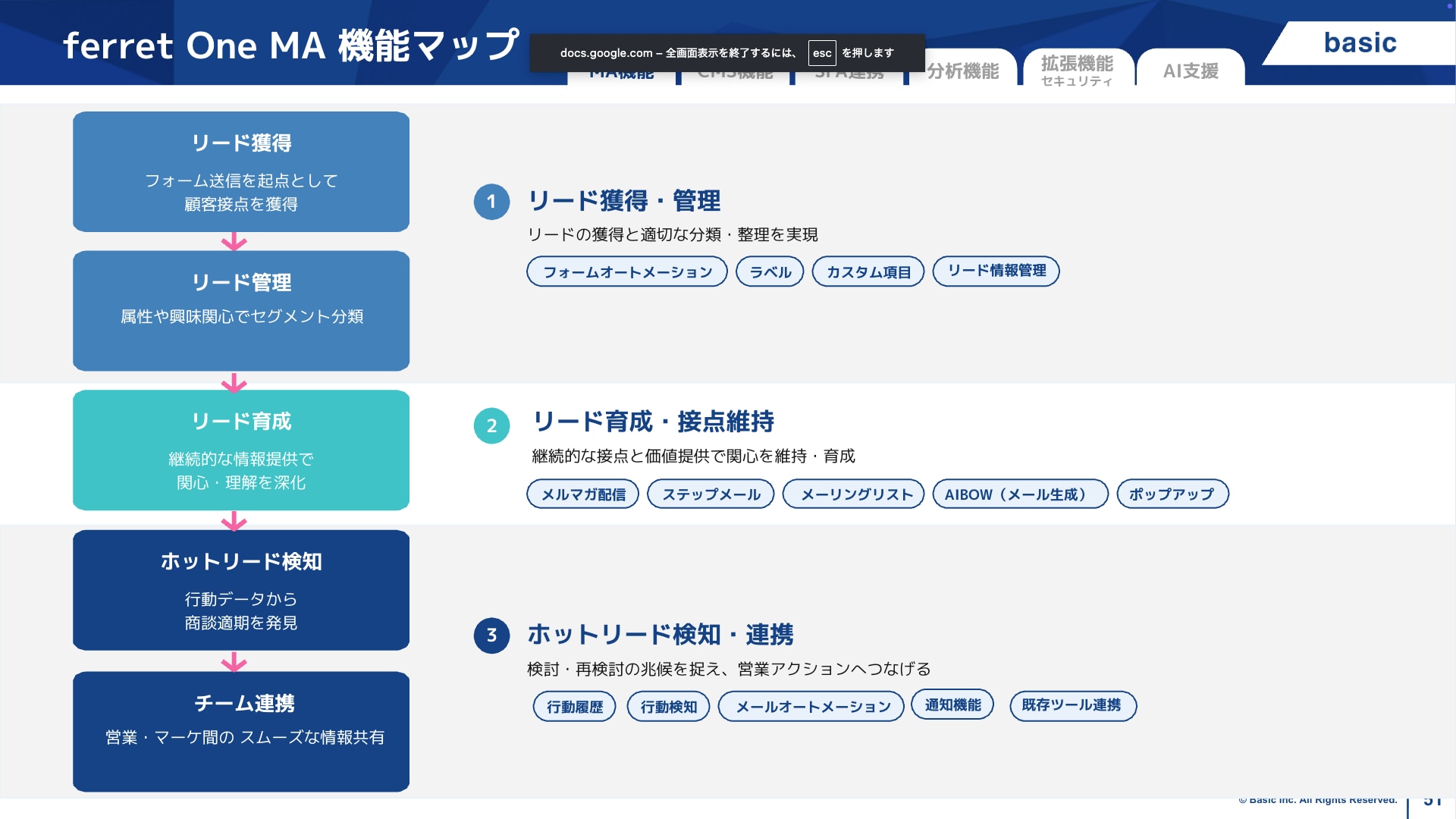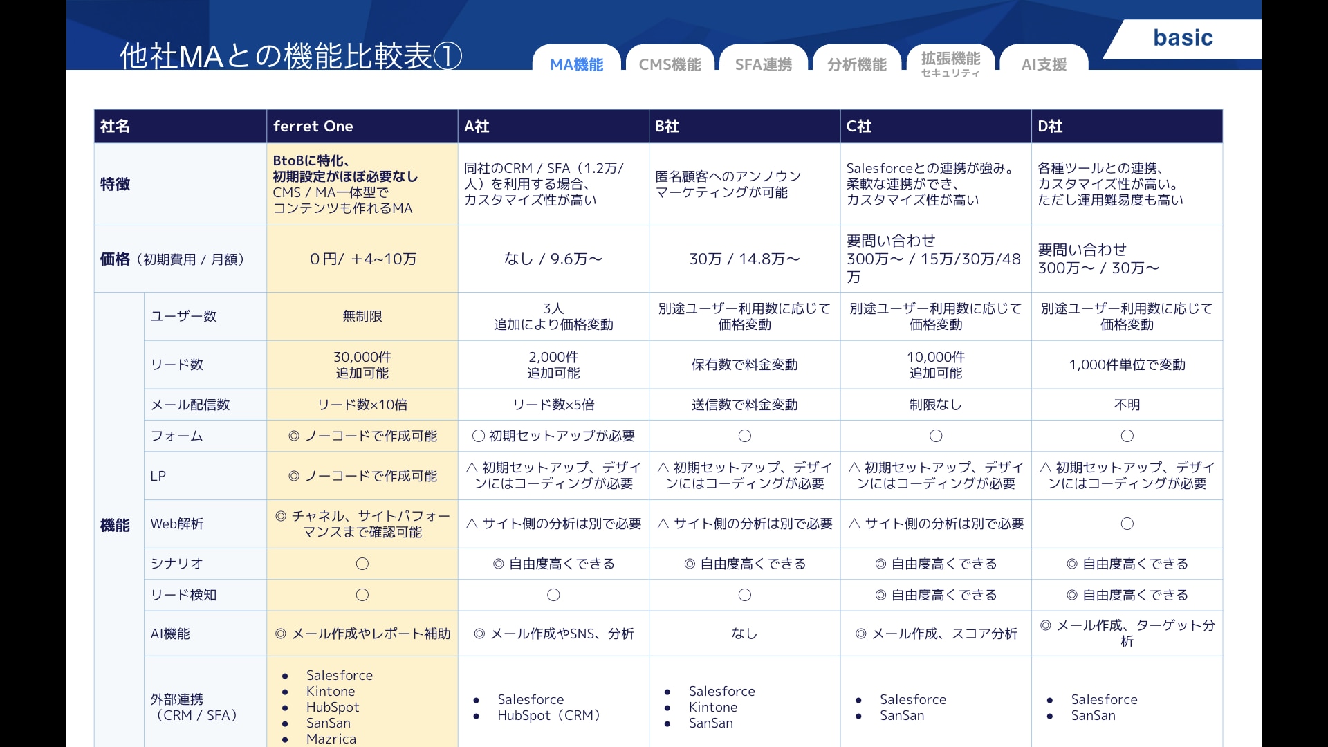 ferret One MAは「営業がいつ、誰に、どう動くべきか」を明確にするために必要な機能に絞り込んだ設計思想。必要十分な機能で導入後の運用負荷を大幅に軽減しております。本資料では、ferret One MAの機能一覧表や各機能の特徴、他社MA機能との比較を一覧で確認できます。