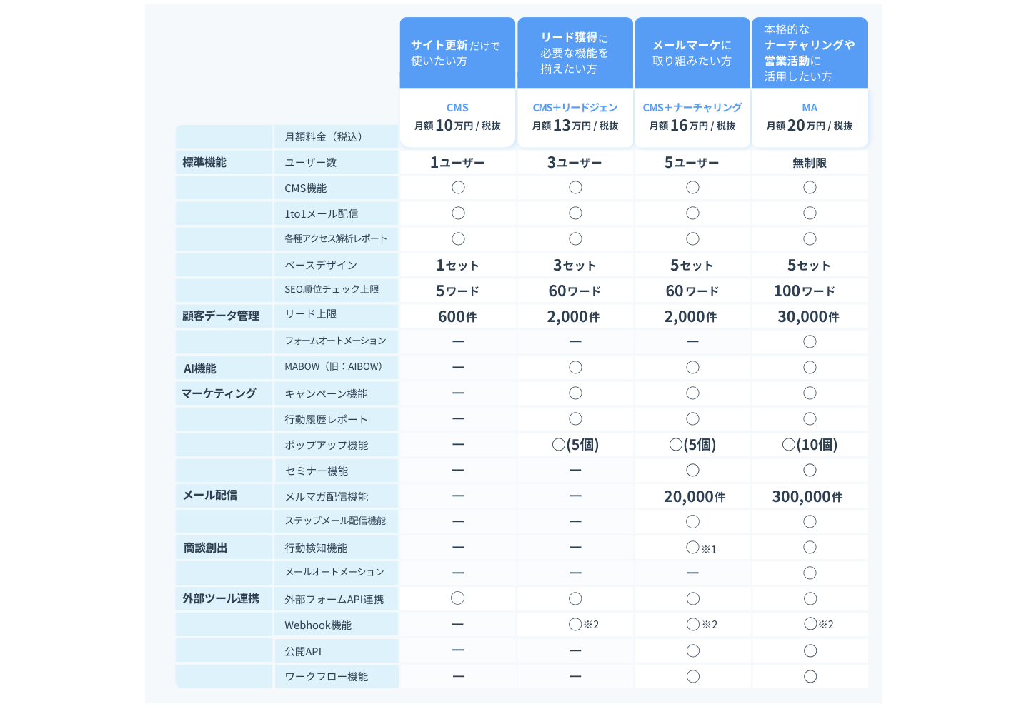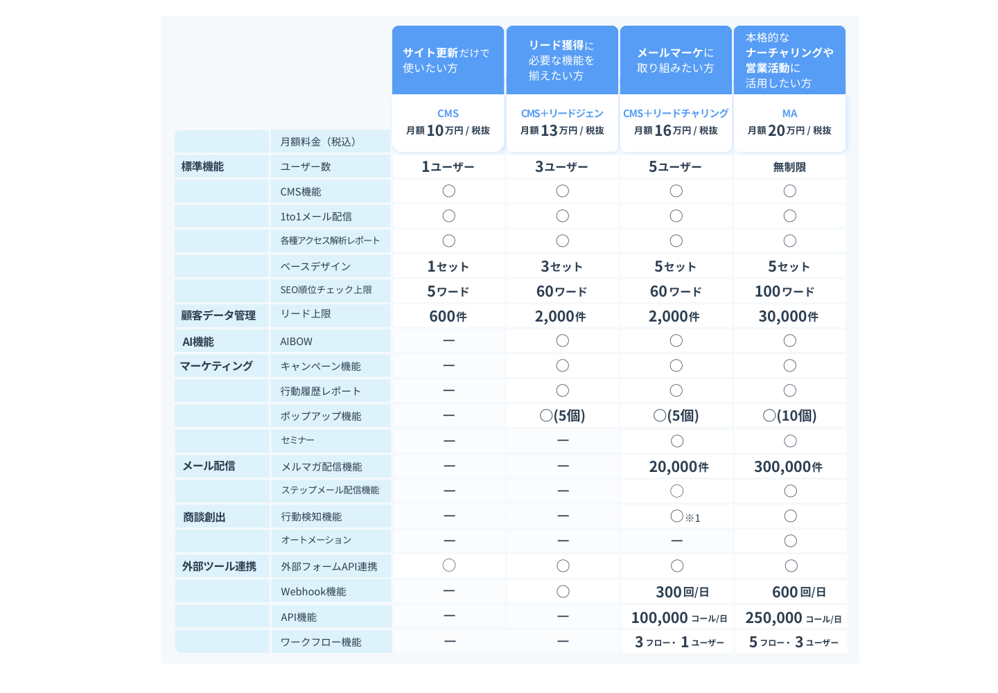 ※上記プランは最新プランです。ご契約中のプランを確認したい場合は、こちらからお問い合わせください。 ※1:ferret OneCMS+ナーチャリングプランの行動検知機能では、検知条件のカスタマイズはできません。