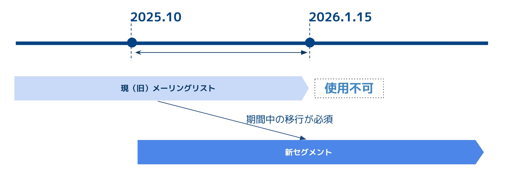 旧メーリングリストにあって今後も活用するリストについては、お手数ですが新セグメントへの移管(再作成)をお願いいたします。