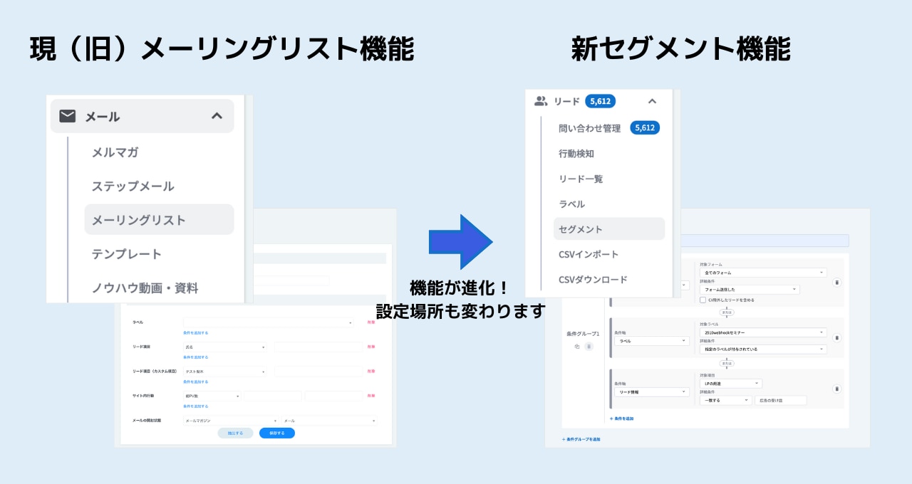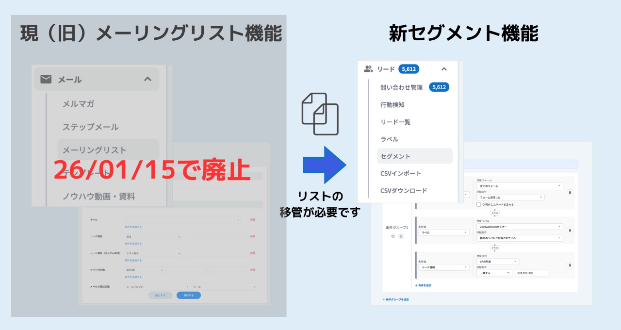 新しいセグメント機能は、今の「メーリングリスト機能」に代わる機能です。