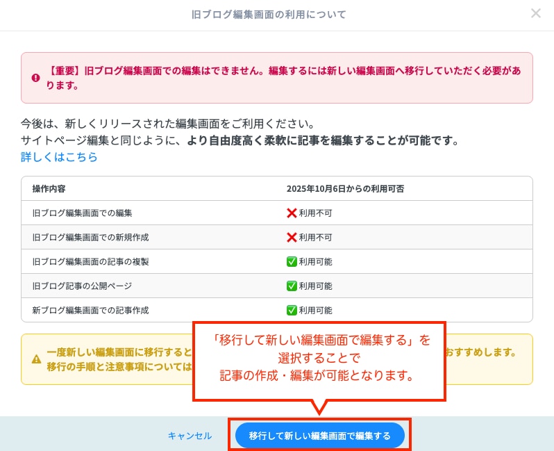 ただし一度新ブログ機能の編集画面に移行すると、旧ブログ機能へ戻すことはできないためご注意ください。