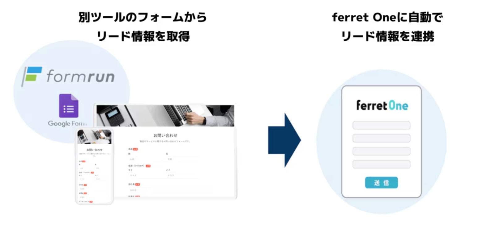 formrun、Typeform、Googleフォームなど、外部ツールで取得したリード情報をferret Oneへ自動連携します。