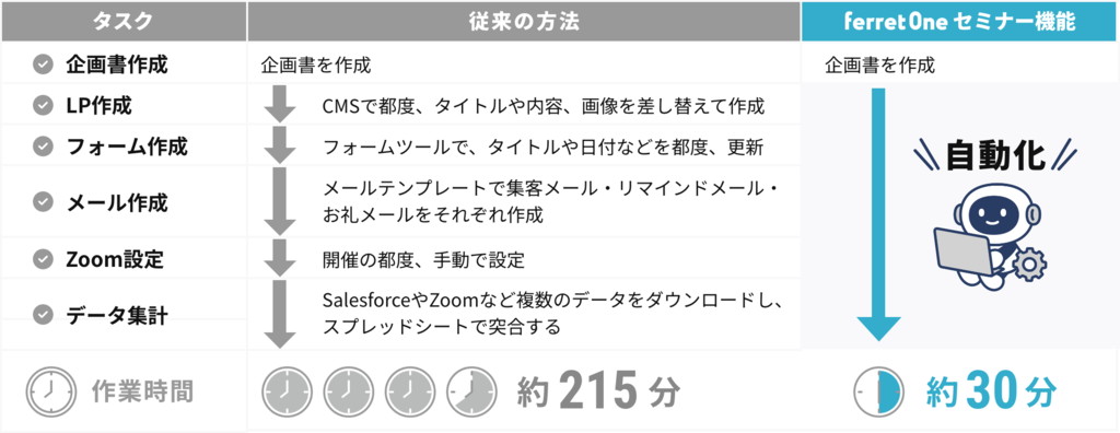 本機能は、必要な情報を入力するだけで申し込みページ・フォーム・メールなどを自動生成し、通常215分*1かかるとされているセミナー準備工数を30分へ短縮することができます。