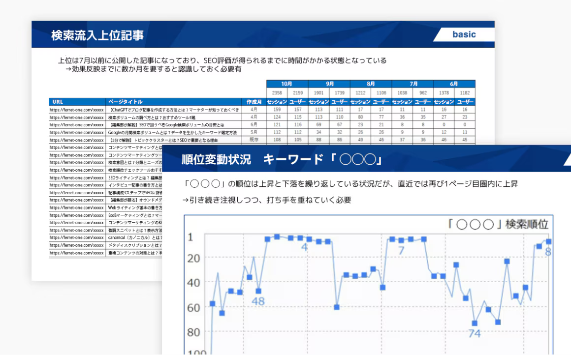 施策の成果について分析結果をレポート提出し、順位状況、流入状況などをご報告します。また、記事骨子のフィードバックやリライトの提案もいたします。